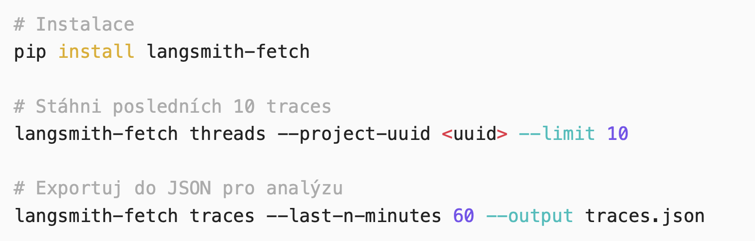 Traces jsou samozřejmě dostupné přes API a nástroje jako Claude Code s nimi umí pracovat přímo. Ale pro rychlý debugging je někdy příjemnější CLI. langsmith-fetch je jednoduchý nástroj pro stahování traces do terminálu.